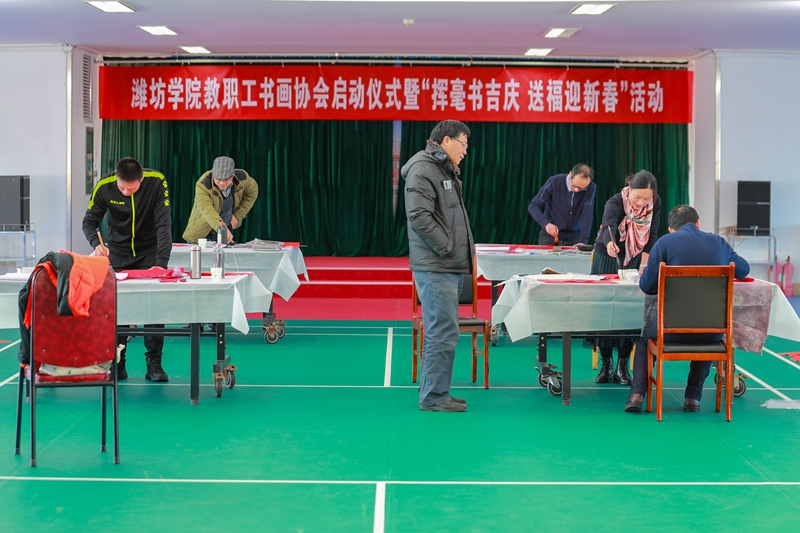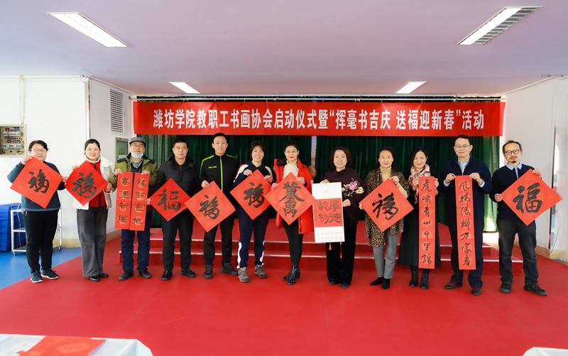 本網訊 1月13日,濰坊學院教職工書畫協會在學校行政樓八樓“教職工之家”舉行啟動儀式,同時開展了“揮毫書吉慶,送福迎新春”活動。協會以寫春聯、贈福字的形式為廣大教職工送去一份新年的祝福。活動現場,廣大會員和書法愛好者現場揮毫潑墨,共同書寫新春祝福和對2022年的美好愿景。
