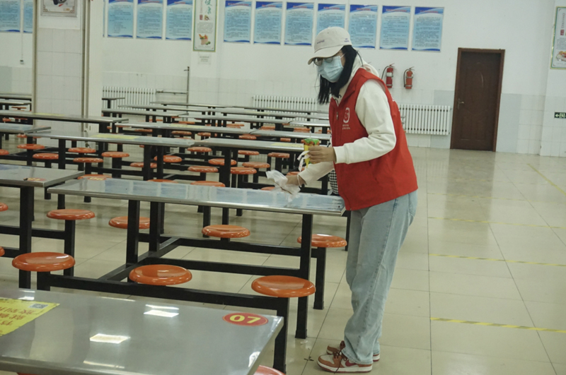 志愿者們在餐廳張貼“一米線”“間隔坐”“面向東”的標語,提前用錄音喇叭錄好提醒同學們戴口罩、一米線、間隔排隊進入餐廳、就餐時同向朝東而坐等的提示語在餐廳入口處播放。每位志愿者都身穿志愿者服,佩戴疫情防控志愿者工作牌,不斷提醒排隊點餐的同學時刻保持一米間距,每個人都嚴格遵守。