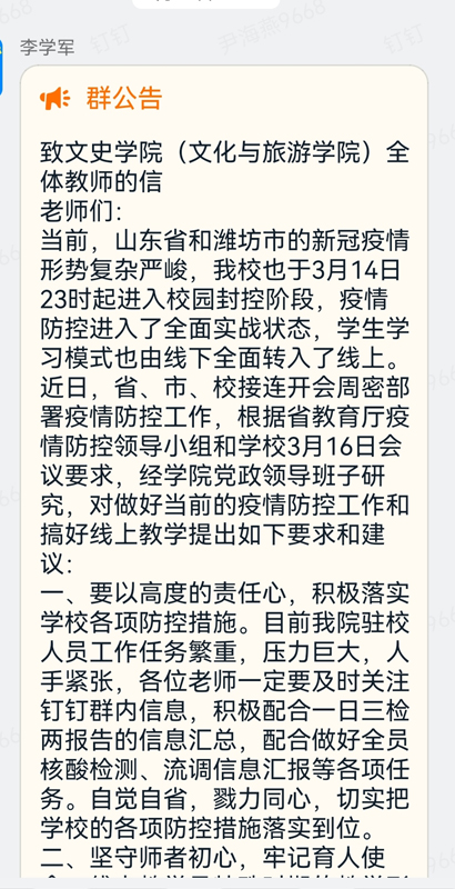 文史學院先后出臺了《文史學院(文化與旅游學院)線上教學實施方案》《文史學院(文化與旅游學院)突發新冠肺炎疫情應急處置預案》,明確人員分工安排,明確線上教學規范。該院負責同志發出倡議,號召老師們創新教學形式,以高質量教學為抗擊疫情貢獻自己的力量。該院組建了線上教學督導群,在督導教師教學質量的同時,及時幫助老師和學生協調線上教學遇到的問題。