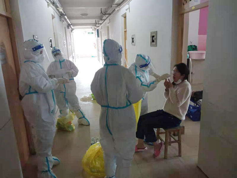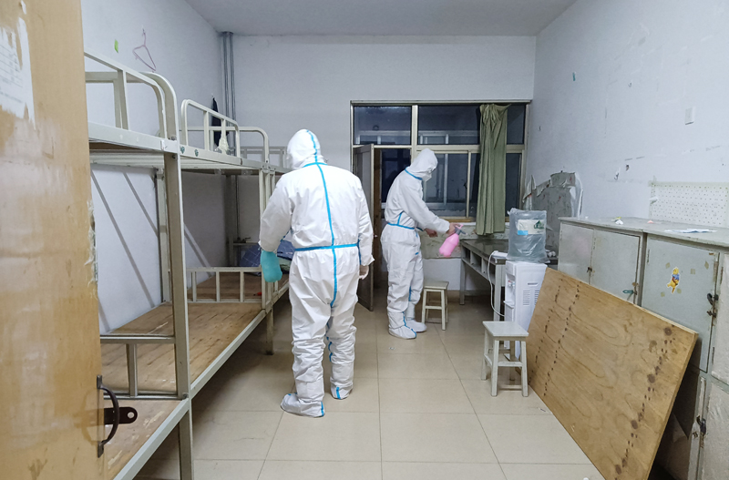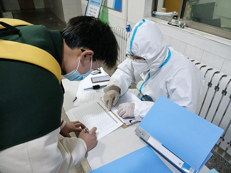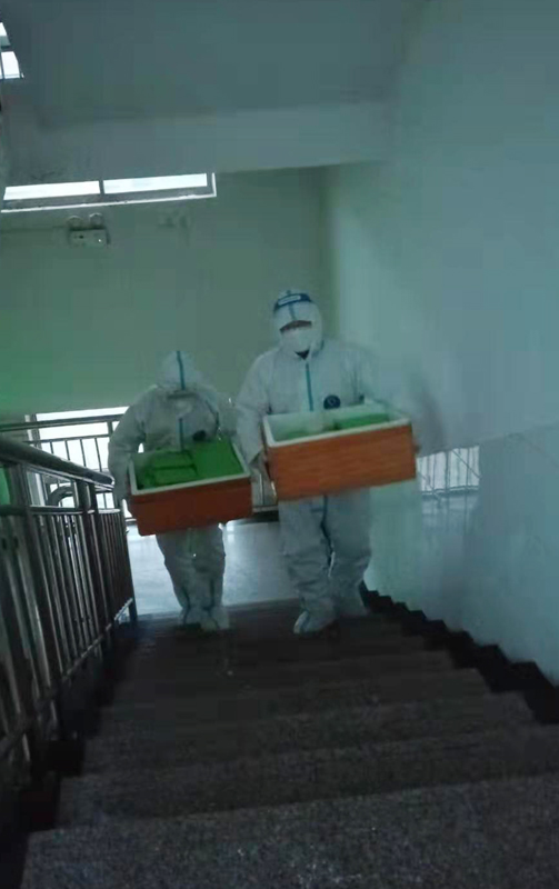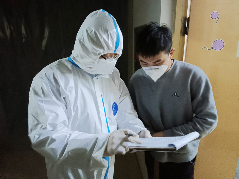 來到安順當晚,韓鍇主動要求承擔最具風險的工作,下沉到抗疫最前線。凌晨1點多,他住進了該校區的居家健康監測中心,近距離服務在此居家健康監測的人員。因為居家健康監測人員不允許出房間門,所有的物資都需要工作人員送到門口,韓鍇接到的第一個任務就是給剛入住的居家健康監測人員送飲用水。十九斤的桶裝水,他一次提兩桶,爬到五樓,挨個送到房間門口,來去往返好多趟。此后居家健康監測中心便成了他所有的活動場所。作為居家健康監測中心的“大管家”,事無巨細都要由韓鍇帶領的管控服務小組負責,隨時解決監測人員的問題和需求,一日三餐的發放、垃圾回收、打掃衛生,生活物資如香皂、衛生紙、垃圾袋等的傳遞與分發,還要負責監控每位隔離人員的身體狀況,一日三統計,核酸檢測、防疫消殺更是樣樣不漏。二百多斤的一個胖子,穿著防護服每天上下五樓無數次,汗透衣背是常態,困了就合衣坐在凳子上瞇一會兒。