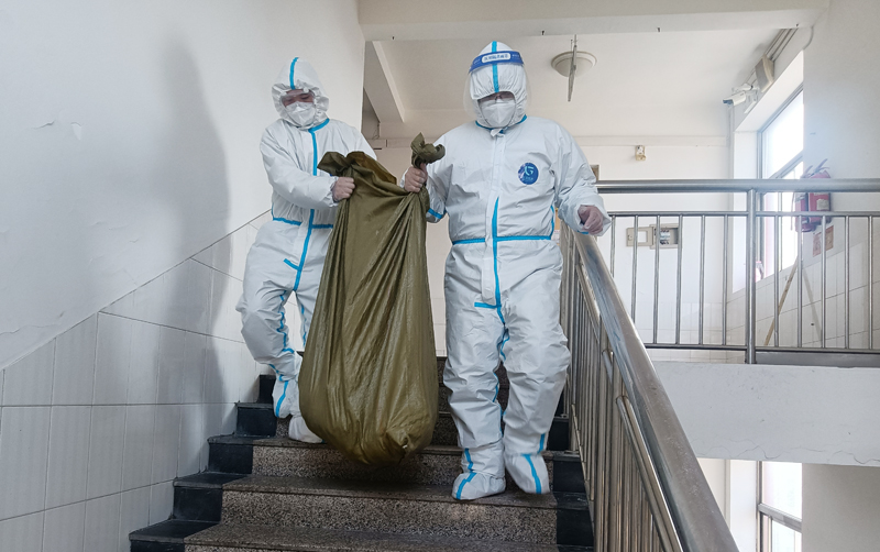 “呼~!呼~!”他大口大口喘著粗氣,略顯笨重的身軀加上厚重的防護服導致他步履維艱,上樓的腳步也因此蹣跚起來。但他沒有停下,每上一個臺階,提著水桶的兩只手臂便順勢向上蓄力,水撞上桶壁,發出“咚咚咚”的響聲,似在為他喝彩,也似吹響了勝利的號角。