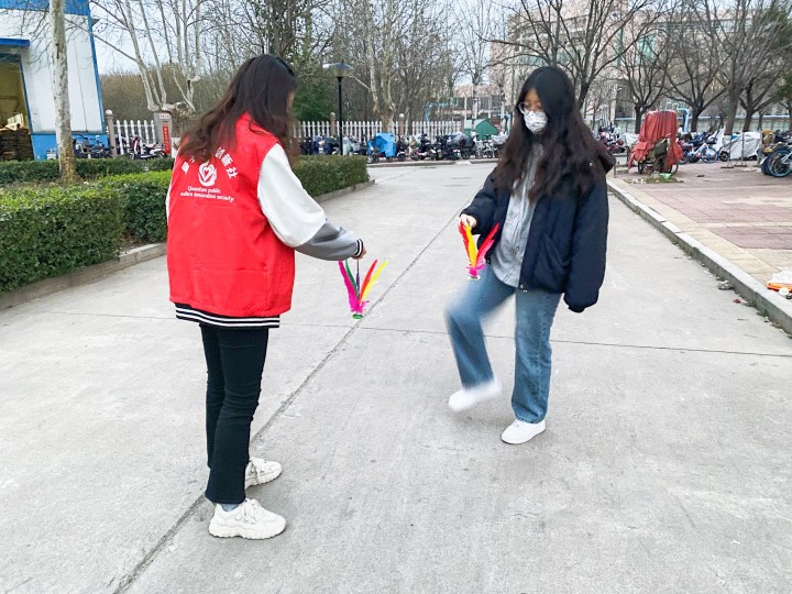 期間,“量子”志愿者聯絡各班心理委員,了解同學們的日常狀態,與心情不佳的同學交流談心。針對正在居家健康監測的同學,志愿者主動關心、安慰同學們不要焦躁,并積極提供生活上的幫助。志愿者們還在小范圍內組織同學們進行室外活動,打羽毛球、打籃球、踢毽子、跳繩……在志愿者的帶領下,越來越多的同學主動走到陽光下,鍛煉身體,呼吸春的氣息。