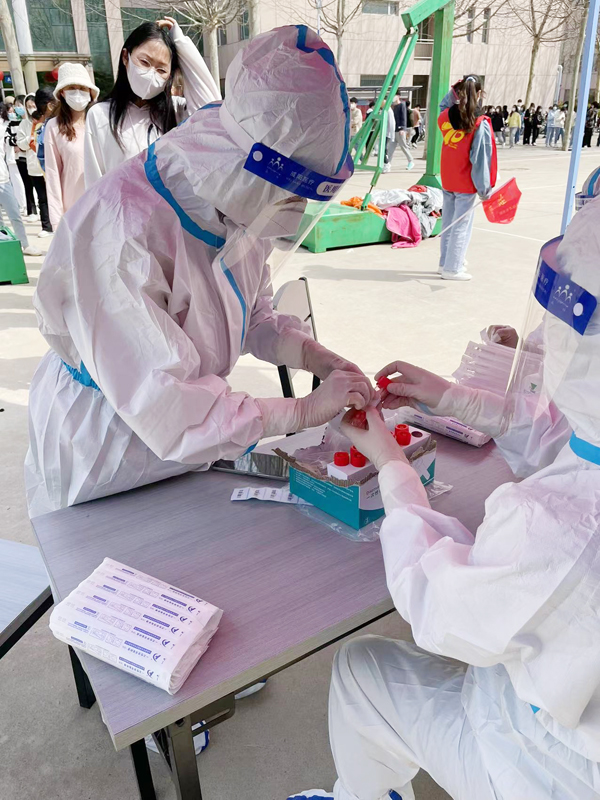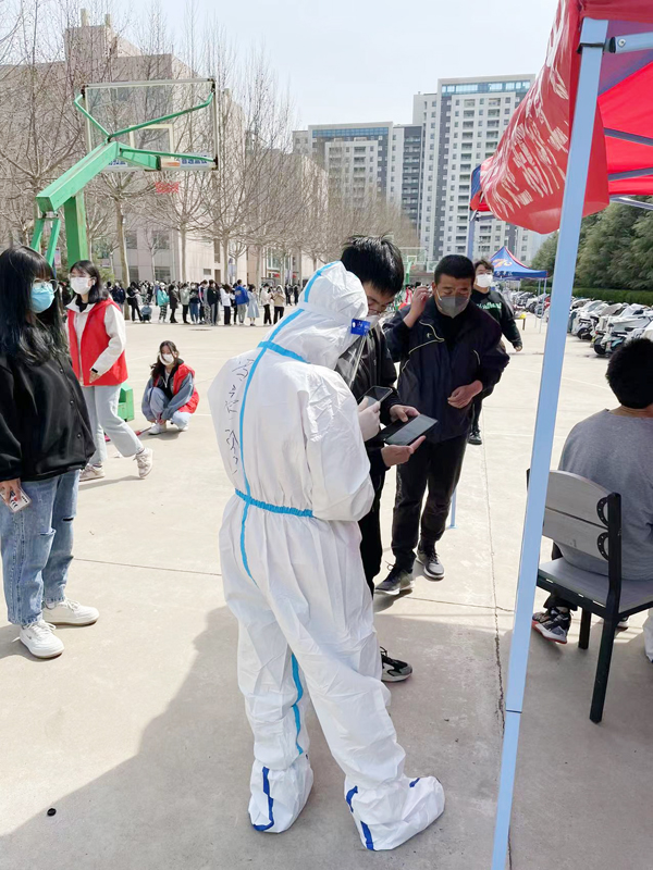 張騫每天起床后就安排當天核酸檢測學生名單,核酸檢測現場始終有他忙碌的身影;學生宿舍更是留下他天天檢查的記錄;反復比對學生檢查檢測數據的電腦前,常常看到他認真仔細的臉龐;解決研究生復試考生問題,一直有他忙前忙后的影子;幫助學生克服心理問題,他不僅辦法多,還積極為學生紓困解難。馮永珍每天穿著密封的防護服奮戰在核酸檢測第一線。夫妻二人一個在組織學生核酸檢測,一個為師生檢測核酸,難得見上一面,有時兩個人在檢測現場碰上,張騫也認不出自己的媳婦,馮永珍也忙得沒時間打個招呼。孩子的舅舅帶孩子回家拿換洗的衣服,經過學校門口,孩子說想爸爸媽媽了,打電話要求跟爸爸媽媽見個面。于是,一家三口隔著圍墻間隔1米,說了幾句話,團聚了片刻。