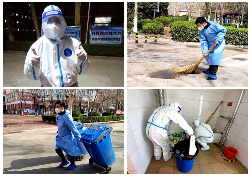 葛厚余在保障組的物業部門,負責整個校區的衛生工作,垃圾清運、道路清掃、餐廳衛生清理……這項工作范圍廣,工作量大,葛厚余始終要求自己精力體力都在線。每天清晨五點起床,穿戴好防護服后開始一天的垃圾清運,完成校區兩千多師生每天日常垃圾的清運,八點半開始打掃餐廳,餐廳的桌凳要逐一進行擦拭消毒,之后清掃校園環境衛生。葛厚余博士說:“雖然這份志愿工作又臟又累,但只要是抗疫需要的,我們就會義無反顧,作為濰院人就要發揚濰院精神,能為抗擊疫情盡一份力,我感到非常榮光。”