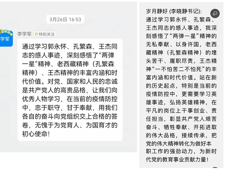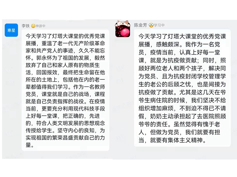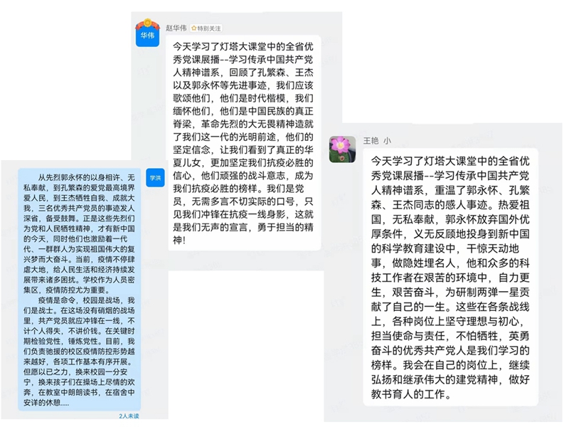 觀看了優秀共產黨員事跡視頻,黨員們聯系本職工作和當前疫情形勢,在各黨支部釘釘群中寫下感言。每篇感言,既是“承諾書”,又是“應戰書”;既是自勉,又是互勉。抗疫中,文史學院15名黨員主動報名擔任學校防控志愿者;黨員干部爭先恐后,率先垂范;夫妻同上抗疫一線,同為志愿者;兩名群眾向組織遞交入黨申請書,接受組織熏陶和歷練,接受組織召喚;一名黨員主動請纓,支援安順校區防控……哪里最危險,那里就有黨員;哪里最艱苦,那里就有黨員;哪里最需要,那里就有黨員。