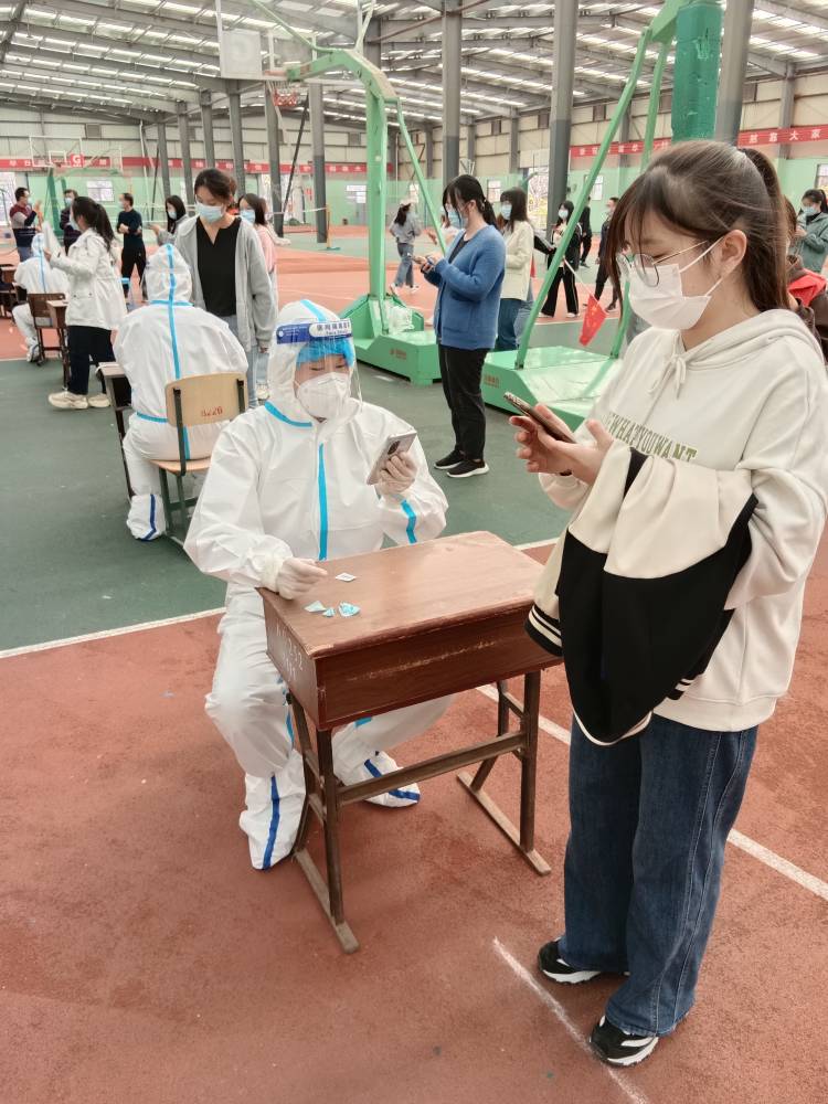 4月4日,商老師被分配到教師黨員志愿者一組任組長,負責風雨球場的核酸檢測的二維碼掃描工作。