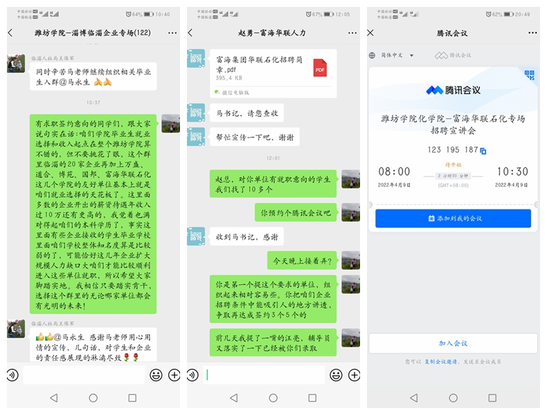 2022年4月9日上午,該院2022年春季首場畢業生線上招聘宣講會——濰坊學院化學化工與環境工程學院-富海華聯石化專場招聘宣講會成功舉辦。富海華聯石化人力資源部主任趙勇進行了一次精準的招聘宣講,12名對富海華聯石化有明確就業意向的畢業生、畢業班輔導員、團總支負責人與趙主任進行了充分的交流。多名畢業生就收入起點、薪資結構、成長路徑、探親假、工作時間等提出問題,招聘宣講人進行了解答。畢業生對視頻面試的細節向趙主任進行了請教。