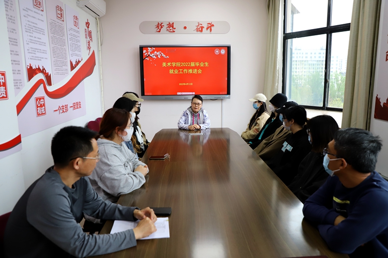 本網訊 為貫徹落實學校畢業生就業工作精神和相關要求,全力以赴做好學院就業工作,4月12日下午,美術學院通過線上線下結合的方式,召開2022屆畢業生就業指導推進會,會議由學院黨總支書記劉雪梅主持。受疫情防控影響,副書記仉新剛、輔導員李旭昌和畢業生的學生黨員和學生干部代表在1505現場參加,其他畢業生在釘釘平臺云端觀看。