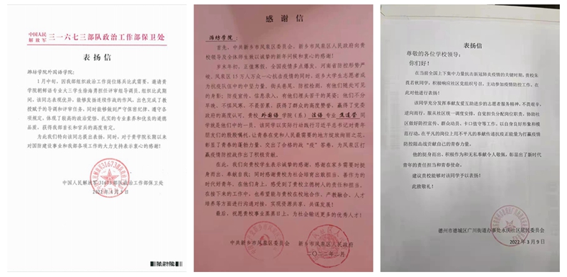 在學校外,外院學生志愿者依舊保持做好志愿服務的青春本心,沖鋒戰“疫”在前,屢受褒獎。寒假期間,該院徐海勇同學,積極響應部隊號召,志愿作為評審組導調員,出色地完成了導調和評審任務,獲得中國人民解放軍31673部隊首長的高度肯定;焦連瑩同學,作為返鄉大學生志愿者之一,積極投入到家鄉抗疫隊伍中,受到當地人民政府的贊揚;朱莨若秋同學,積極響應社區黨組織號召,主動參加疫情防控工作,得到當地社區的表揚。