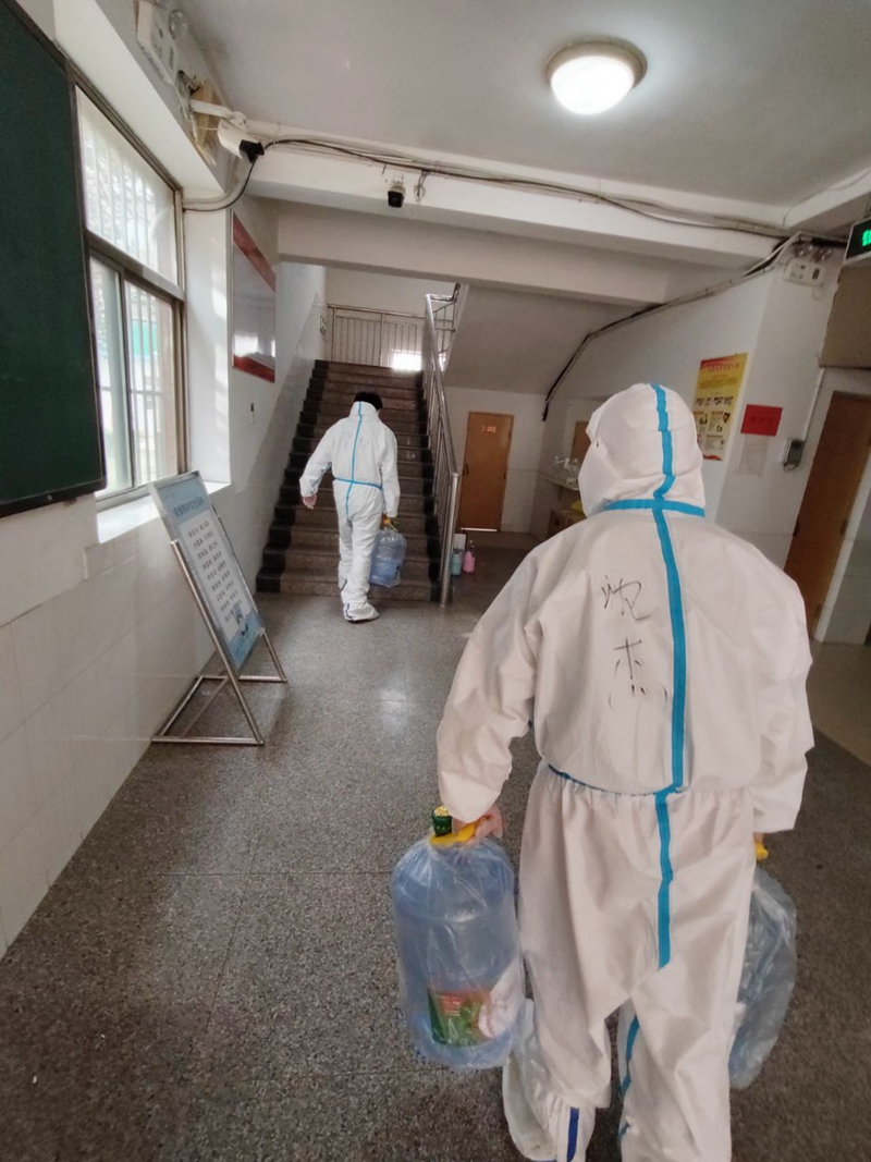 志愿服務的主要任務是保障健康觀察期學生的生活需要和身心健康,但具體工作卻千頭萬緒:每天給住在四樓五樓的學生運送一日三餐、肩扛桶裝水、傾倒生活和醫療垃圾、打掃全樓的環境衛生、做好日常消殺、做好學生健康監測、滿足學生的各種日常需求,及時為出入人員辦理手續。由于要長時間、近距離與健康觀察人員接觸,志愿者要跟醫務工作者一樣做好全身防護。隔離衣、防護服、面罩、兩層手套、N95口罩一樣都不能落下。為了節約防疫物資,防護服里的老師們常常是好幾個小時不能上廁所,不喝一口水,口罩的內側被水汽濡濕,嘴皮卻有些許干裂。