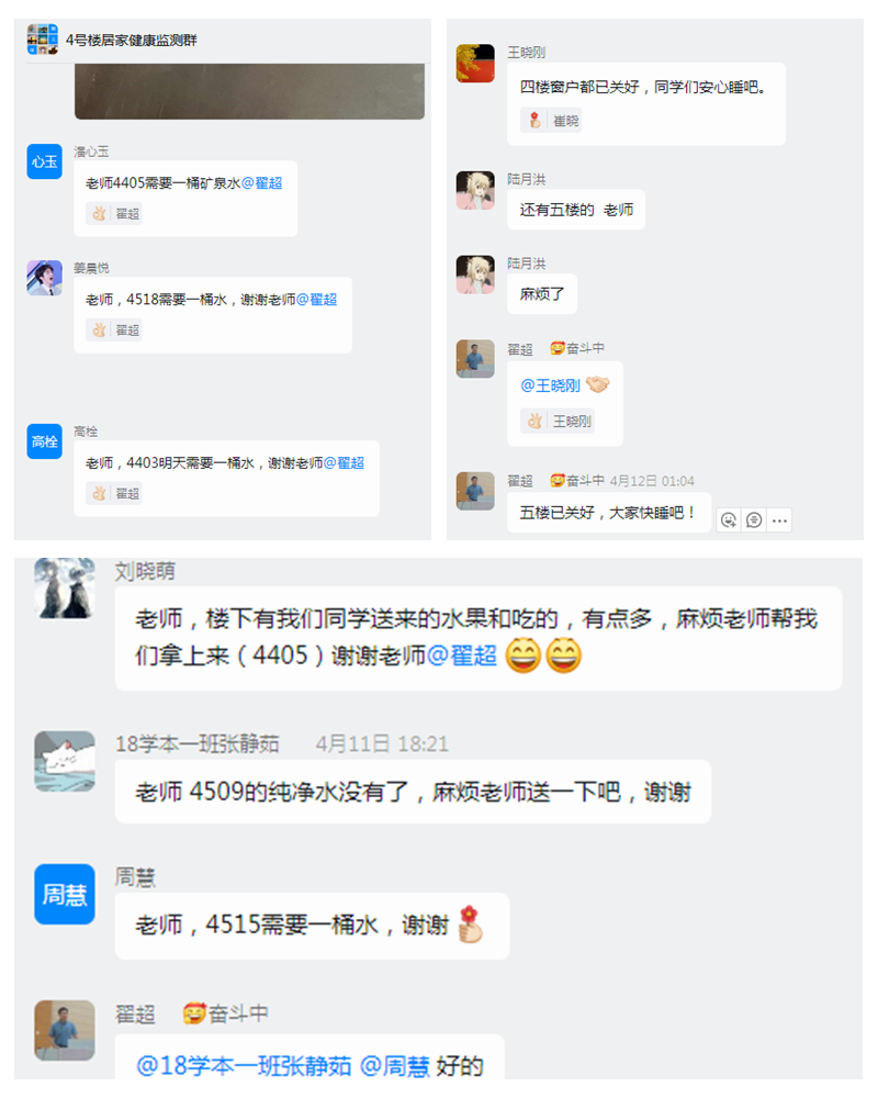 談到為什么選擇志愿服務,沈杰主任說:“馬書記和倪院長親自帶隊,師生們都十分感動,也大受鼓舞,我們是學生工作的排頭兵,參加志愿服務責無旁貸。”翟超老師放棄了輪替休息回家和家人慶祝自己30歲生日的機會,他說:“校園里的學生已經可以正常活動,仍處于健康觀察期的同學心里肯定很著急,我曾經住在這里,熟悉里面的環境,也更能體會他們的心情,所以我最應該留下。”進駐健康觀察中心的那天,老師們都帶著電腦,因為在忙碌的志愿服務之余,他們還要繼續承擔原來的本職工作。