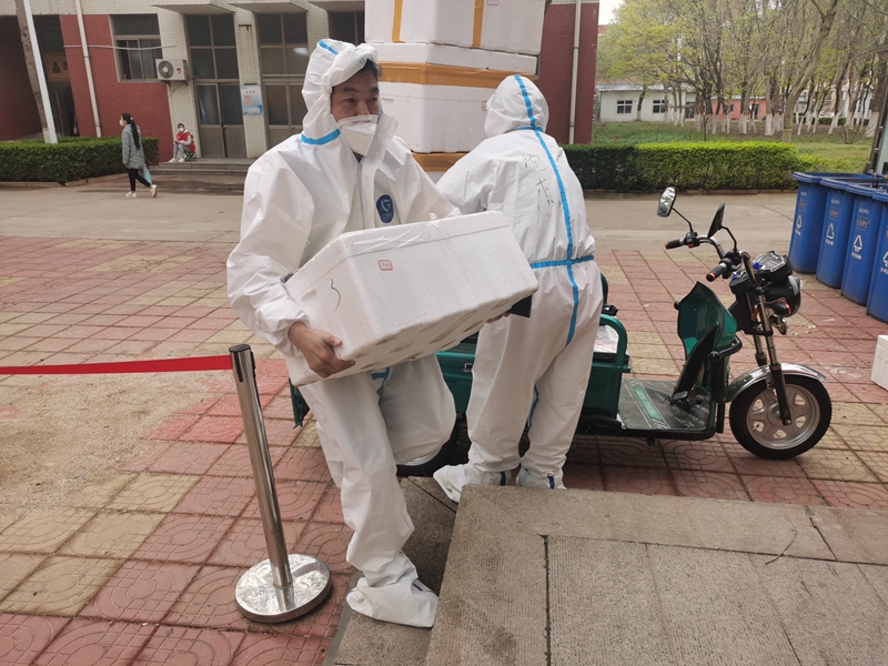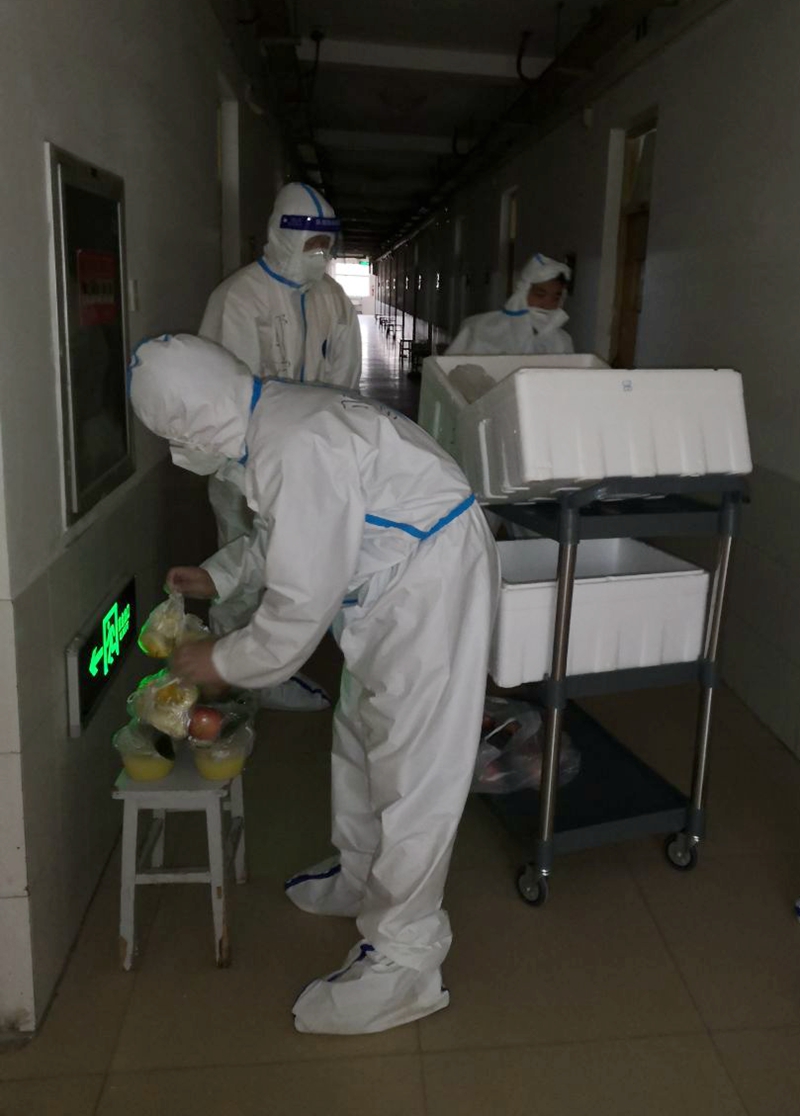 早春的濰坊,氣溫有時達到三十多攝氏度。談及工作中的感受,邵啟鼎老師這樣描述:“最難熬的是配送午餐階段,氣溫接近三十度,而起初住校時大家帶的都是冬天的衣物,在層層防護服的包裹下,汗如雨下,內層的衣服很快濕透,最難受的是汗水直往眼睛里流,下意識去擦,手套就碰到了防護面罩,汗沒有擦去視野卻變模糊了。這次志愿服務真正體會到了醫務工作者們工作的辛苦。”即使在這樣的環境下,老師們依舊及時滿足學生需求,讓不能出房間的同學感受到春天般的溫暖。