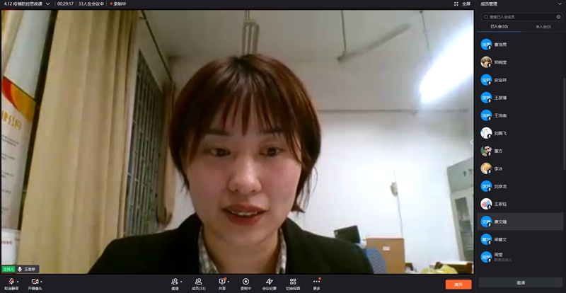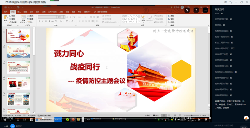 學院黨總支書記周瑩以《在戰“疫”中綻放大寫的青春》為主題,通過釘釘線上平臺為所聯系班級2020級數學與應用數學專業學生上了一堂生動的疫情防控思政課。周瑩帶領同學們回顧了學校抗擊疫情的全過程,向同學們傳達了當前學校疫情防控政策及措施要求,將發生在身邊的真實抗疫故事和感人事跡轉化為鮮活的教育素材,引導同學們學習弘揚偉大抗疫精神,展現青年大學生責任擔當,做“胸有大志,心有大我,肩有大任”的人,以高度的責任心和強烈的使命感,為校園疫情防控工作貢獻自己的一份力量。