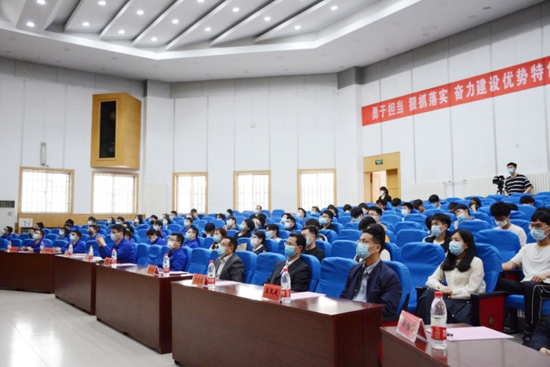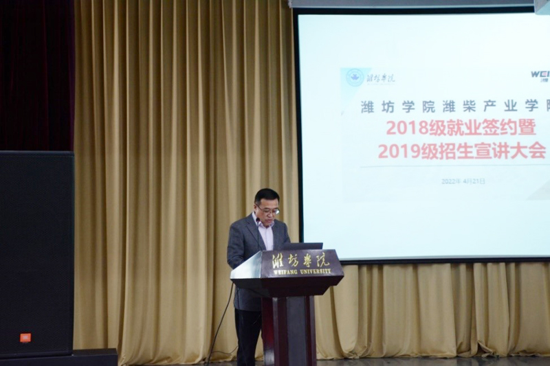 在全體與會師生的見證下,濰柴集團人力資源部相關同志與2018級15名學生簽訂聘任協議。濰柴職業大學常務副校長鐘建民,結合產業學院人才培養理念,從濰柴企業發展戰略、企業文化、入職待遇、職業發展等方面進行了招生宣講。