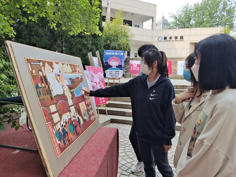 隨后,大家來到薈萃樓一樓院內,參觀了美術學院師生作品主題展。這些招貼宣傳作品主題鮮明、思想明確,熱情抒發愛國情懷,科普防疫知識,傳遞青春正能量,引導大學生熱愛黨,增強政治定力,在新征程上繼續發揚“跟黨走”的光榮傳統和優良作風,充分展現了我校大學生的責任擔當和共克時艱、積極向上的精神風貌。