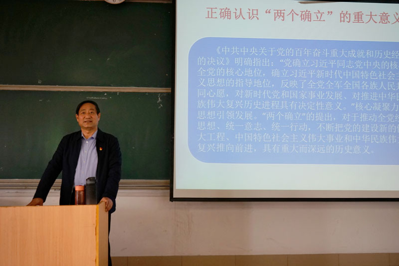 李學軍在講解黨的十九屆六中全會精神時,重點對“兩個確立”的深刻內涵和決定性意義進行了闡述。要求全體入黨積極分子認真學習黨的十九屆六中全會精神,把對黨史的認識、對黨的十八大以來新時代的認識和習近平新時代中國特色社會主義思想的認識,統一到黨的十九屆六中全會精神上來。他還結合4月25日習近平總書記考察中國人民大學時對青年學生提出的要求,希望同學們準確把握習近平新時代中國特色社會主義思想的深刻內涵,堅定理想信念,奮發有為,聽黨話,跟黨走,為實現中華民族偉大復興貢獻自己的一份力量。