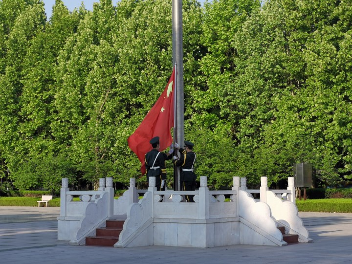 升旗儀式于6時40分正式開始,國旗護衛隊喊著響亮的口號,邁著有力的步伐,莊嚴地將國旗送到升旗臺下。隨后,伴隨著慷慨嘹亮的《義勇軍進行曲》,五星紅旗冉冉升起,同學們心中熱血澎湃,全體肅穆莊嚴地向國旗行注目禮。