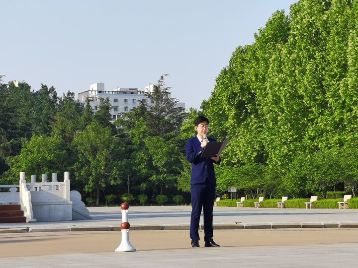 之后,物理與電子信息學院學生會主席房德正作為學生代表,在國旗下做了以“越百年櫛風沐雨,綻芳華乘風破浪”為題的發言。2022年是中國共青團建立100周年,100年來,眾多的仁人志士,愛國青年紛紛涌現,讓中國歷經磨難而不倒。房德正從中指出少年強則國強,青年興則國家興這一觀點,由此提醒同學們,青年是國家的希望,祖國的未來,作為當代青年,我們要繼承先輩的光榮傳統,弘揚“五四”愛國精神,艱苦奮斗,勇毅前行,在偉大新征程上譜寫新篇章。