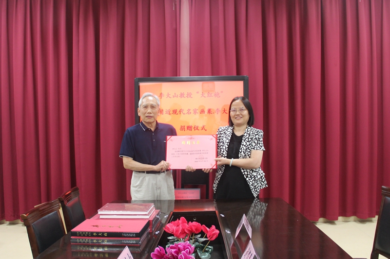 李大山向學校圖書館捐贈了近期由天津人民美術出版社出版的《中國近現代名家畫集李大山》及上海人民出版社出版的《李大山畫集》。館長秦瑞鴻代表圖書館接受了捐贈并向李大山教授頒發了捐贈證書。本次捐贈既豐富了圖書館的館藏資源,又為美術課教學、科研提供了高水平的專業文獻。