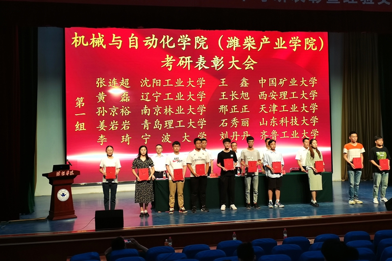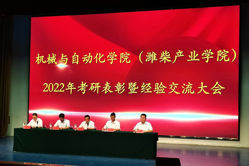 本網訊 為了更好地推進考研工作,6月6日,機械與自動化學院(濰柴產業學院)在圖書館報告廳舉行2022年考研表彰暨經驗交流大會。學院院長劉永勝,黨總支副書記馮道俊,副院長王文成、解福祥出席會議,畢業班輔導員盧麟、譚俊峰,考研成功的學生及2019級部分學生參加大會。大會由團總支書記尚志杰主持。
