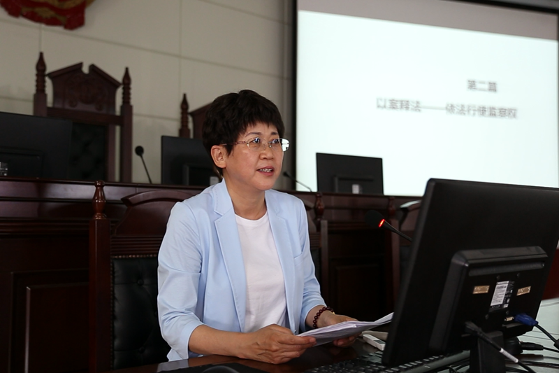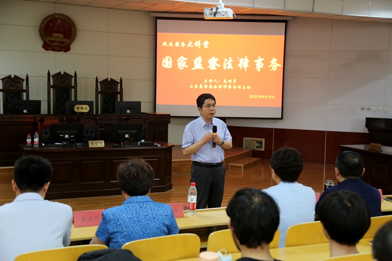 本網訊 6月15日下午,全國人大代表、山東鳶都英合律師事務所主任、最高人民法院特約監督員高明芹律師在人合樓8321模擬法庭為政法學院法學專業學生帶來一場以監察法律實務為主題的講座,政法學院黨總支書記曹興波、院長苗金春、副院長杜立聰、司法教研室主任朱文英參加。