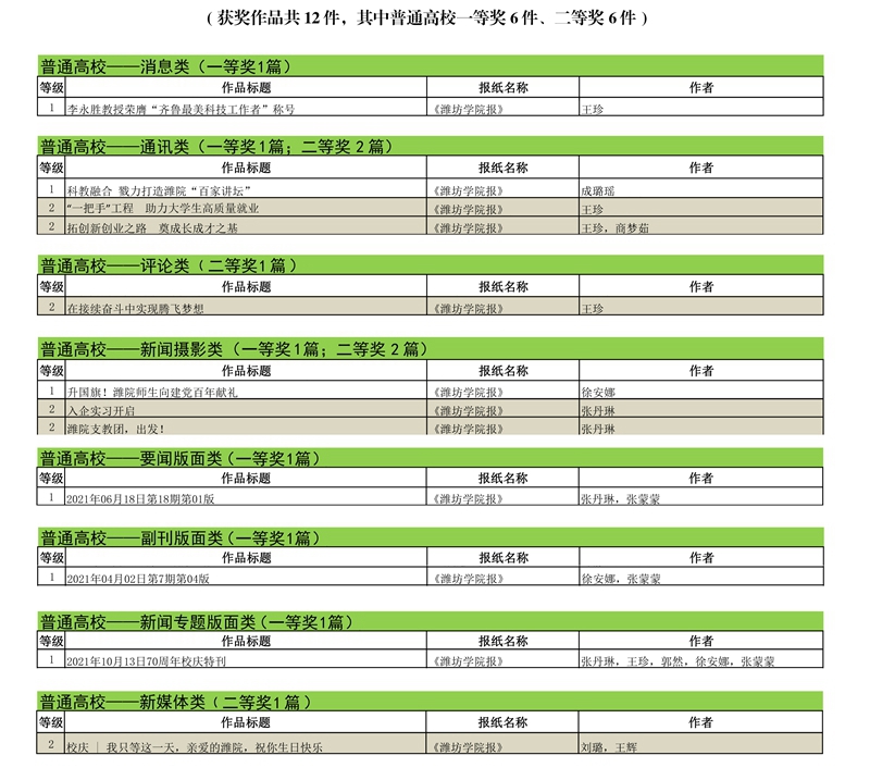 本次評選中,作品《李永勝教授榮膺“齊魯最美科技工作者”稱號》(作者王珍)獲消息類一等獎;作品《科教融合 勠力打造濰院“百家講壇”》(作者成璐瑤)獲通訊類一等獎;作品《升國旗!濰院師生向建黨百年獻禮》(作者徐安娜)獲新聞攝影類一等獎; 版面類作品2021年第18期第01版、2021年第7期第04版、2021年70周年校慶特刊分獲要聞版面類、副刊版面類、新聞專題版面類一等獎;作品《“一把手”工程 助力大學生高質量就業》(作者王珍)《拓創新創業之路 奠成長成才之基》 (作者王珍、商夢茹)獲通訊類二等獎;作品《在接續奮斗中實現騰飛夢想》(作者王珍)獲評論類二等獎;作品《入企實習開啟》《濰院支教團,出發!》(作者張丹琳)獲攝影類二等獎;官微作品《校慶 | 我只等這一天,親愛的濰院,祝你生日快樂》獲新媒體類二等獎。