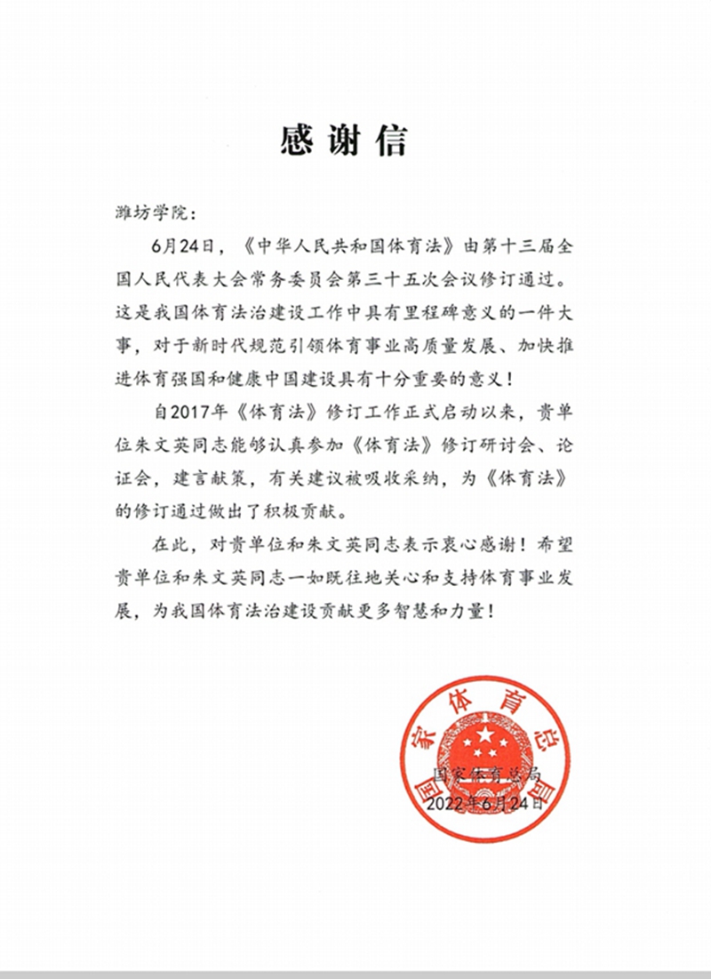 本網訊 近日,國家體育總局致信我校,感謝政法學院朱文英教授為《體育法》修訂工作做出的積極貢獻。朱文英教授向來關注國家體育事業發展和體育法治建設,自2017年《體育法》修訂工作正式啟動以來,朱文英教授認真參加相關修訂研討會、論證會,建言獻策,有關建議被吸收采納。