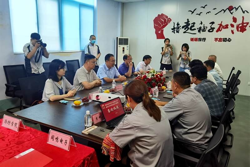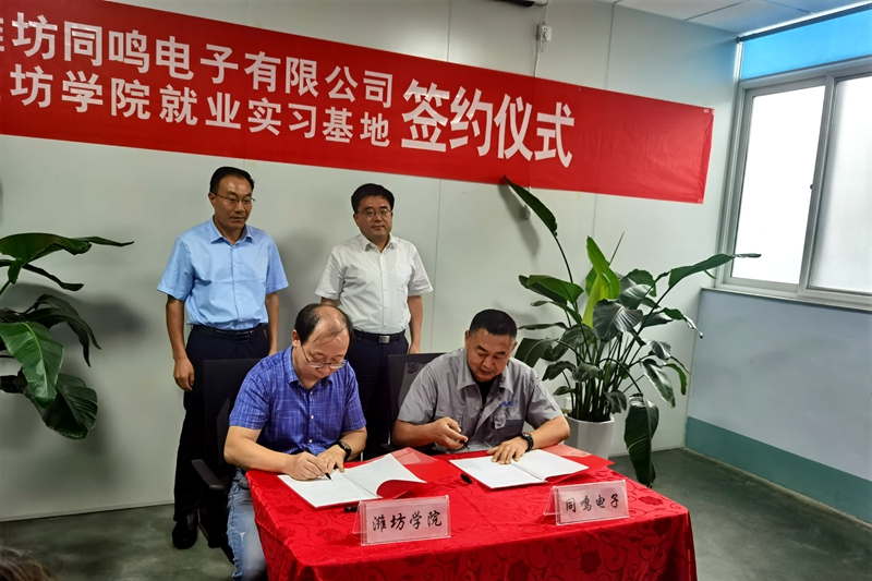 本網訊 7月16日,濰坊學院就業實習基地簽約及授牌儀式在坊子經濟發展區同鳴電子有限公司舉行,物理與電子信息學院黨總支書記賀志波、院長李英德等相關負責同志,坊子區委常委、宣傳部長曹建國,坊子區教體局黨組書記、局長李漢軍,濰坊同鳴電子有限公司總經理王顯強等參加儀式。