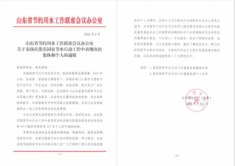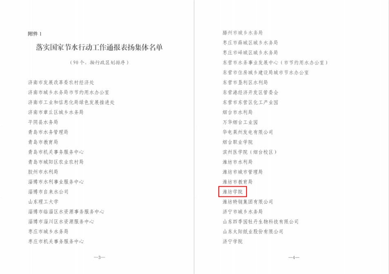本網訊 近日,我校在落實國家節水行動工作中表現突出,受山東省水利廳通報表揚。國家節水行動是黨中央、國務院重要決策部署,2019年以來,我校在省委、省政府正確領導下,認真貫徹習近平總書記“節水優先、空間均衡、兩手發力”治水思路,勇于擔當,開拓創新,扎實推動《山東省落實國家節水行動實施方案》貫徹落實,用水量得到有效控制,用水效率持續提升,水資源集約節約利用能力顯著增強,在同行業中發揮了模范表率作用。