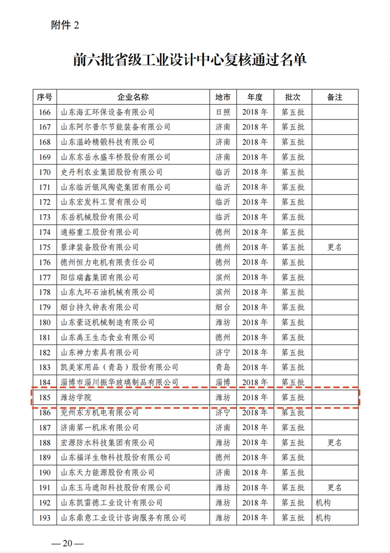 我校工業設計中心是2012年濰坊市首批認定的市級工業設計中心之一,并于2018年獲批省級工業設計中心。該中心立足濰坊面向全省重要的工業制造領域,以工業設計關鍵共性問題為科研方向,堅持多學科交叉和產教融合,組建起一支由工業設計、機械設計、智能制造等高級專業技術人才組成的工業設計研發團隊。通過產學研合作,強化應用型人才培養和科研成果轉化。推動并成立濰坊市工業設計產業創新聯盟。目前該中心已完成省市級科研課題的申報立項10余項,完成第五屆、第六屆濰坊市“市長杯”工業設計大賽的組織評審等工作。此次復核通過既是對兩年來中心工作的高度肯定,也是我校多年來積極投入,大力支持平臺建設,各級平臺建設取得顯著成果的縮影。