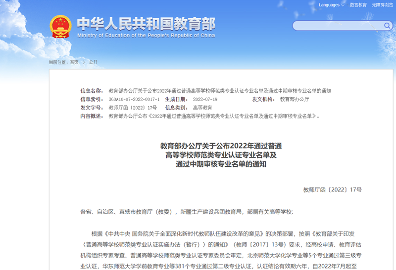 本網訊 近日,教育部辦公廳發布《關于公布2022年通過普通高等學校師范類專業認證專業名單及通過中期審核專業名單的通知》,經高校申請、教育部評估中心和山東省教育科學研究院分別組織專家考查、普通高等學校師范類專業認證專家委員會審定,我校小學教育專業通過第二級專業認證,認證有效期六年(2022年7月至2028年6月)。截至目前,我校共有數學與應用數學和小學教育2個專業通過這一認證。