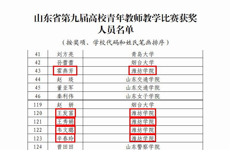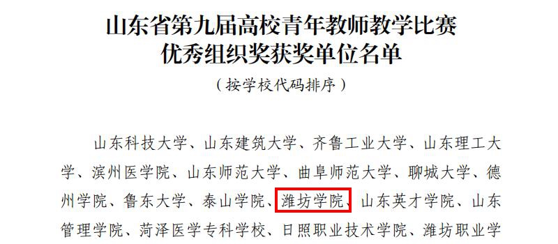 本網訊 近日,山東省第九屆高校青年教師教學比賽獲獎人員名單和優秀組織獎獲獎單位公布,我校教師化學化工與環境工程學院霍燕芳獲得二等獎,王發富、王秀娟、韋文璐、辛春玲四位老師獲得優秀獎,我校獲優秀組織獎。