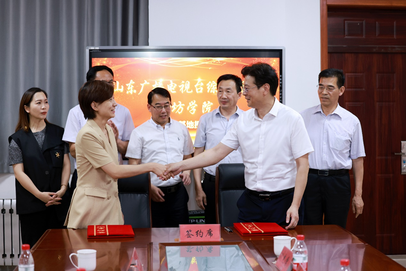 本網訊 近日,我校傳媒學院與山東廣播電視臺電視綜藝頻道簽訂就業實習基地合作協議。學校黨委委員、宣傳部長單振濤,山東廣播電視臺電視綜藝頻道副總監謝菂,啟迪控股東北亞總部總裁助理、啟迪之星(青島)常務副總經理劉立新及傳媒學院負責同志出席了簽約儀式。