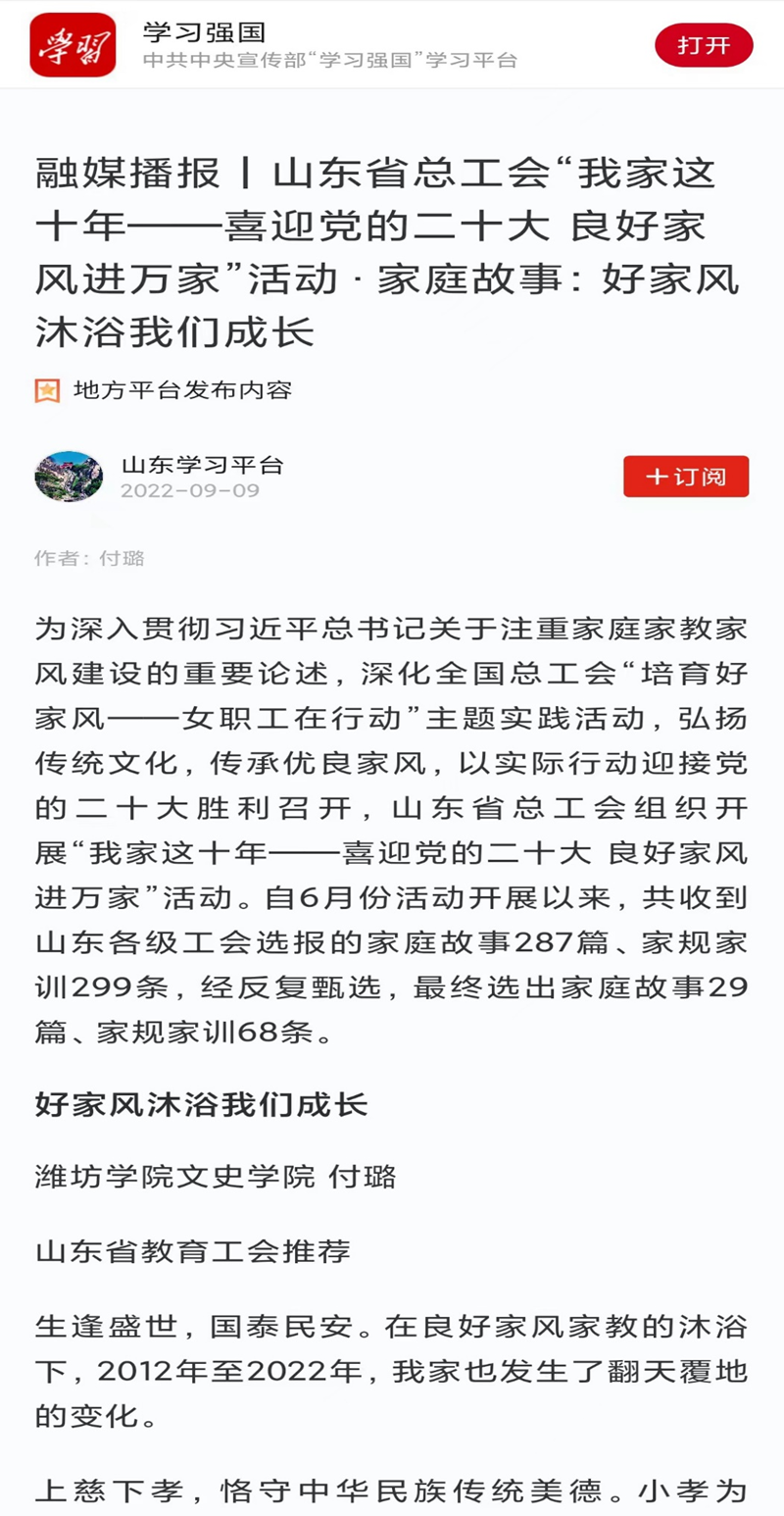 本網訊 近日,中共中央宣傳部“學習強國”學習平臺通過 “山東學習平臺”發布了我校文史學院教師付璐文章《好家風沐浴我成長》。