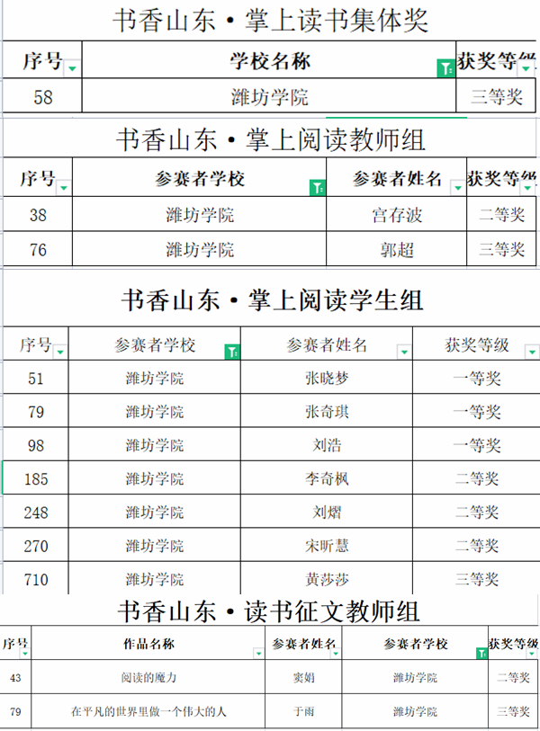 本網訊 由山東省委宣傳部指導,山東省教育廳主辦,山東省語言文字工作委員會辦公室、山東教育電視臺聯合承辦的山東省高校師生“奮進新征程 建功新時代”閱讀活動,近日陸續公布獲獎名單。本次活動共分為“書香山東·掌上讀書”“書香山東·讀書征文”“書香山東·朗讀經典”三個子項目,依據“閱讀闖關”“知識在線答題”“征文評選”等階段成績綜合評定,共確定集體獎58個,我校榮獲“書香山東·掌上讀書”集體獎三等獎。在個人獎中,我校師生也收獲頗豐:“書香山東·掌上閱讀”教師組獲二等獎1項、三等獎1項,學生組獲一等獎3項、二等獎3項、三等獎1項;“書香山東·讀書征文”教師組獲二等獎1項、三等獎1項,學生組獲一等獎2項,三等獎3項,李冬燕、王愛紅被認定為“優秀指導教師”;“書香山東·朗讀經典”學生組獲一等獎2項、二等獎1項、三等獎2項,徐金德、吳瑜、陳思雨、石正濤被認定為“優秀指導教師”。
