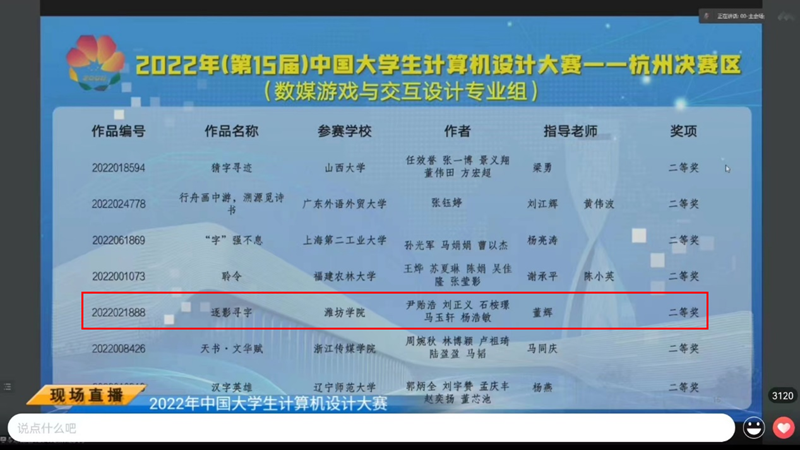 本網訊 近日,2022年(第15屆)中國大學生計算機設計大賽暨數媒游戲與交互設計大賽(杭州決賽區)決賽于線上舉行。由我校傳媒學院董輝老師指導,2019級數字媒體技術專業學生尹貽浩、劉正義、石桉璟、馬玉軒、楊浩敏制作的游戲設計作品《逐影尋字》獲得數媒游戲與交互設計專業組二等獎。此外,傳媒學院還有多項作品在省賽中獲獎:《易學-在線平臺教育》獲一等獎、《年年有余》獲三等獎、《百字閣火鍋店室內設計》與《閣夜》獲優秀獎。