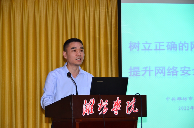 本網訊 9月23日,學校黨委理論學習中心組(擴大)進行集體學習,邀請濰坊市委網信辦王震科長作網絡安全專題輔導報告。黨委委員、宣傳部部長單振濤主持報告會。學校黨委書記李東,黨委委員馬茜華、朱猷武、王旭升、王建新參加學習。
