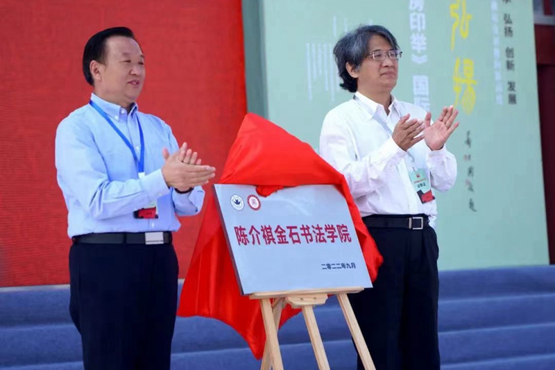 本網訊 9月25日,“第四屆陳介祺藝術節”開幕式在濰城區十笏園文化街區中心廣場舉行。開幕式上,舉行了“陳介祺金石書法學院”揭牌儀式。中國書法家協會分黨組副書記、秘書長鄭曉華與我校黨委書記李東共同為“陳介祺金石書法學院”揭牌。