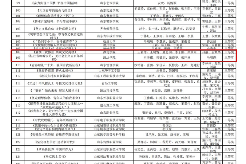 本網訊 近日,山東省教育廳公布了首屆全省高校大學生講思政課公開課展示活動獲獎名單,我校數學與信息科學學院團隊參賽作品《賡續千秋偉業 共筑文化高樓》、物理與電子信息學院團隊參賽作品《憶往昔崢嶸歲月,見社會主義五百年歷程》榮獲非專業組三等獎,并被推薦參加教育部高校思政課教學指導委員會主辦的國賽。