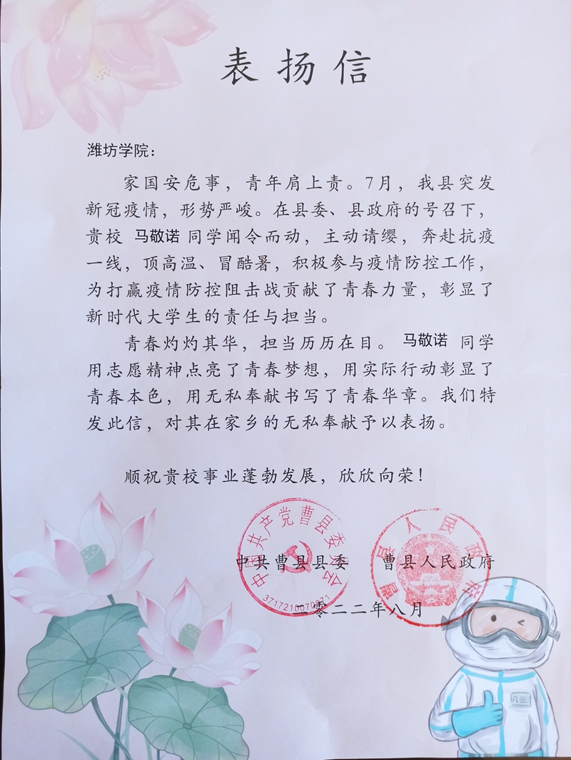 本網訊 9月23日,我校收到中共曹縣縣委、曹縣人民政府發來的表揚信,信中對經濟管理學院會計學專業2022級馬敬諾同學暑假期間積極響應縣委、縣政府號召,主動投身疫情防控工作,為家鄉做出的無私奉獻予以表揚。