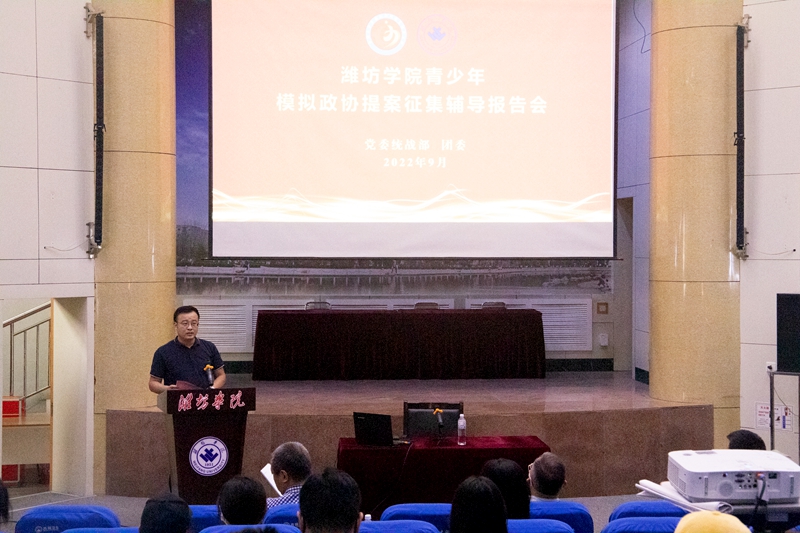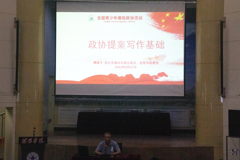 本網訊 9月27日,學校統戰部與團委聯合舉行2022年青少年模擬政協提案征集輔導報告會。特邀濰坊市政協常委、經濟管理學院魏建平教授作專題輔導,統戰部、團委主要負責同志,各學院110名學生代表參加報告會。