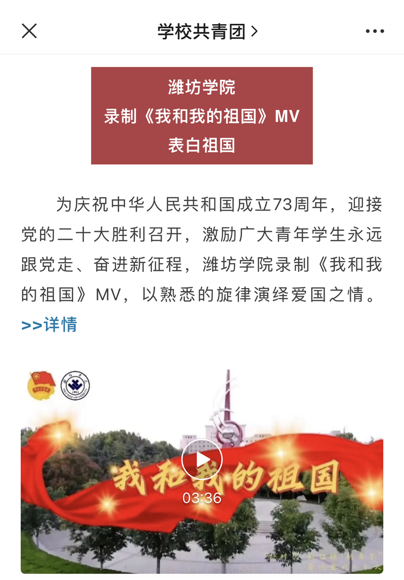 目前,《我和我的祖國》MV連續兩天在團中央官方公眾號《今天,這些高校亮了!》《升國旗,奏國歌!青春告白祖國,你的學校怎么做?》展示,與清華大學、浙江大學、華僑大學等高校同篇報道,總閱讀量近10萬,有效傳播了濰院青年昂揚向上的精神風貌。