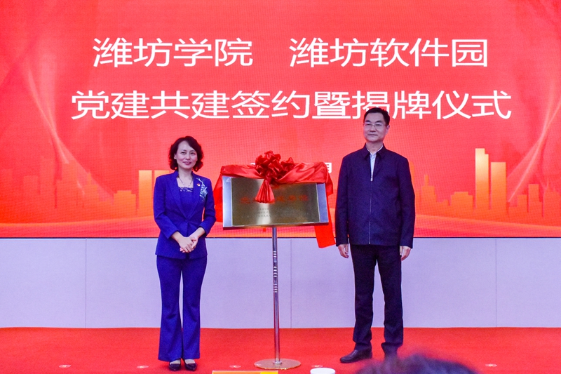 本網訊 10月12日,我校與濰坊軟件園在濰坊軟件園服務中心舉行黨建共建簽約揭牌儀式,學校黨委副書記徐梅,黨委委員、組織部部長李連成,濰坊市高新區黨工委委員段守華出席儀式。