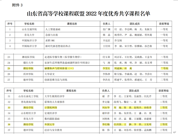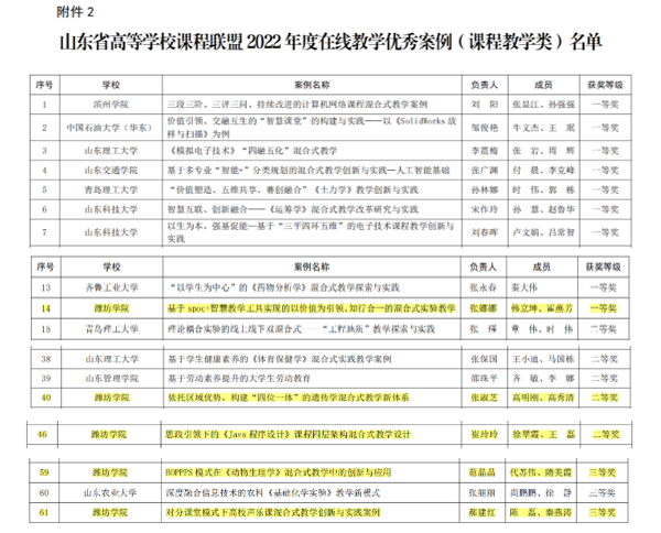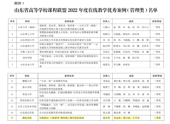 本網訊 近日,山東省教育廳公布了山東省高等學校課程聯盟2022 年度在線教學優秀案例和優秀共享課程獲獎名單,我校推薦的11項參評成果中9項獲獎,其中課程教學類一等獎1項,二等獎2項,三等獎2項;管理類教學案例二等獎1項;優秀共享課程二等獎2項,三等獎1項,獲獎總數和比例在同類高校中位居前列。