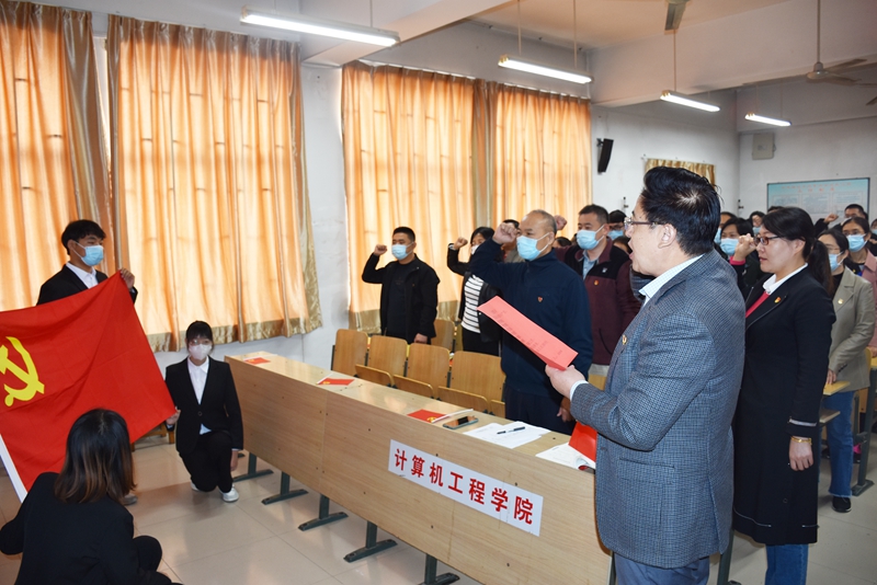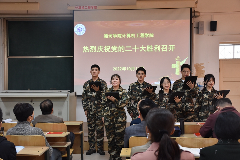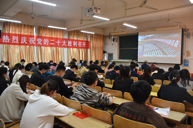 收看大會盛況前,2022級新生代表集體朗誦詩歌《請黨放心,強國有我》,表達了“00后”一代感黨恩、聽黨話、跟黨走的決心,展現了青年學子在青春賽道上踔厲奮發、努力奔跑,為實現中華民族偉大復興的中國夢貢獻力量的青春姿態。隨后,有36年黨齡的老黨員馮偉昌教授,帶領全體師生黨員面向黨旗,重溫入黨誓詞。