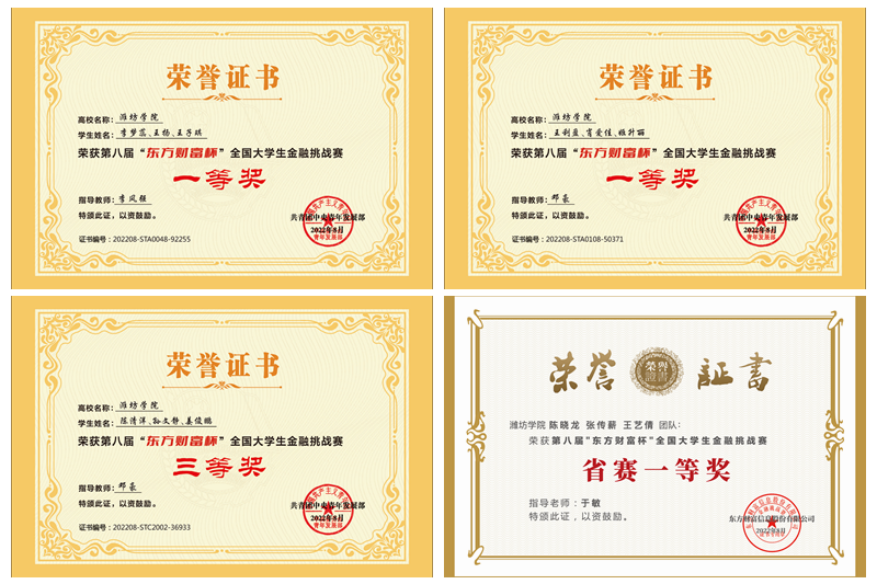 本網訊 近日,由共青團中央青年發展部主辦,全國學校共青團研究中心和東方財富信息股份有限公司共同承辦的第八屆“東方財富杯”全國大學生金融挑戰賽圓滿落幕。我校團隊獲得全國一等獎2項、三等獎1項,獲得山東省一等獎6項、二等獎4項、三等獎14項。