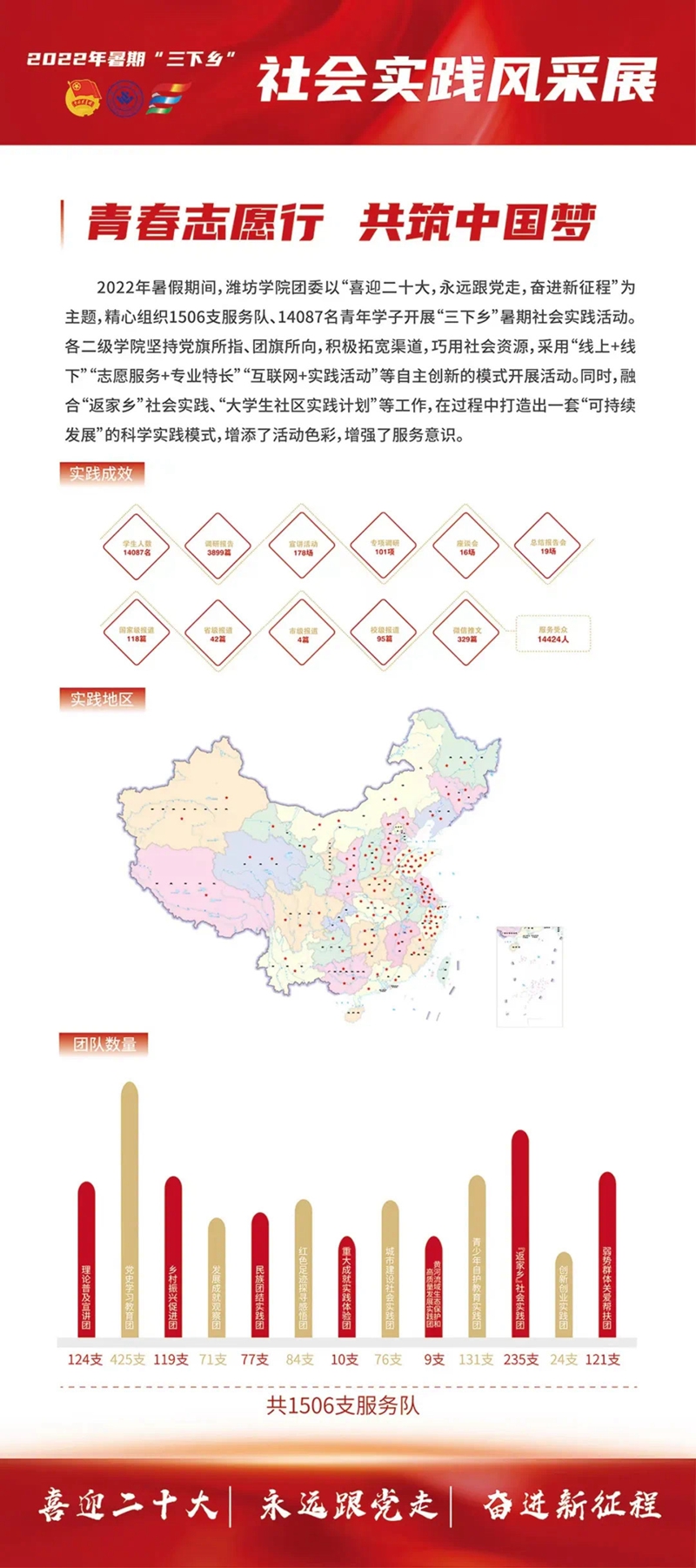 2022年暑期,學校團委積極拓寬渠道,巧用社會資源,融合“返家鄉”社會實踐、“大學生社區實踐計劃”等,共組建2支國家級重點團隊,4支省級重點團隊,5支團中央專項活動實踐團隊,以及146支校級調研實踐小分隊,14087名師生以集中組隊實踐與個人分散實踐相結合的方式奔赴山東、浙江、江蘇、江西、安徽等地開展了以理論普及宣講、黨史學習教育、鄉村振興促進、發展成就觀察、民族團結實踐等為主要內容的“三下鄉”“返家鄉”社會實踐活動。