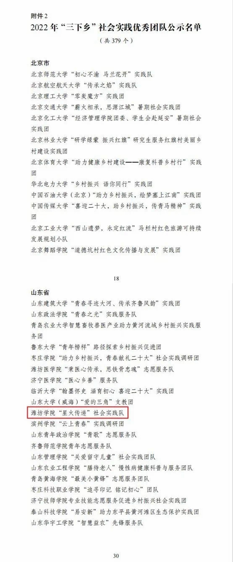 本網訊 近日,共青團中央公布了2022年全國大中專學生志愿者暑期文化科技衛生“三下鄉”社會實踐活動總結結果,我校“星火傳遞”社會實踐隊被授予“優秀實踐團隊”榮譽稱號。