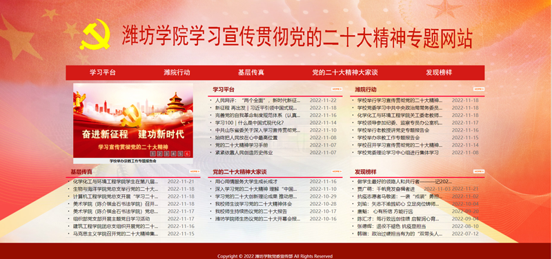 抓好宣傳引導,營造濃厚氛圍。學校堅持多措并舉,有力有效開展宣傳報道,推動學習宣傳貫徹黨的二十大精神持續走向深入。學校上線“濰坊學院學習宣傳貫徹黨的二十大精神專題網站”,開設“學習平臺”“濰院行動”“基層傳真”“黨的二十大精神大家談”“發現榜樣”等版塊,全方位報道學校學習宣傳貫徹黨的二十大精神的具體舉措和實際行動。學校在官網、校報開設專版、專欄,深入報道全校各級黨組織和廣大黨員干部群眾學習宣傳貫徹黨的二十大精神的生動實踐。截至目前,學校專題網站、校報共發布學習宣傳貫徹黨的二十大精神相關稿件96篇和24篇,迅速形成強大宣傳聲勢。