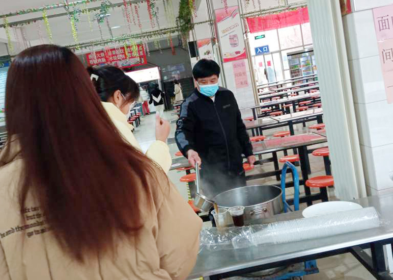 在餐廳一樓,學生服務科的老師一邊幫助同學們分發免費的紅糖姜湯,一邊叮囑他們要多穿衣服,不要吃生冷食物,注意保暖。